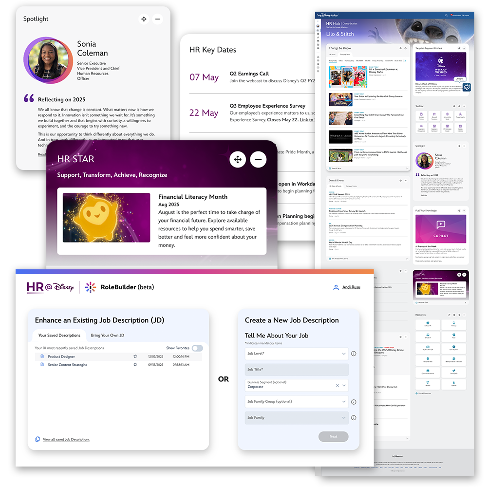 As Senior Manager, Product Design, I lead the design of digital experiences for employees across The Walt Disney Company. I collaborate with Product, Engineering, AI, and People Insights teams, as well as external partners, to design, deliver, and continuously improve employee-facing platforms and tools.